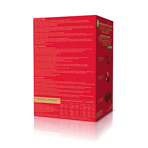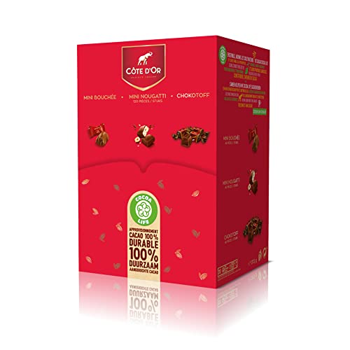 Deze dispenser (1312g) bevat een combinatie aan de beste en populairste Côte d’Or chocolade; mini Bouchée, mini Nougatti en de befaamde Chokotoff. De ideale partner bij een gezellig kopje koffie thuis of op kantoor. Liefhebber van de tedere smaak van Côte d’Or chocolade? Dan is deze dispenser ongetwijfeld de ideale match voor jou! De box is gevuld met een combinatie aan de meest befaamde Côte d’Or producten, namelijk mini Bouchée, Chokotoff en mini Nougatti. Goed voor in totaal 120 stuks aan zoetigheid, omvat in 1312g. Welke Côte d’Or delicatesse is jouw persoonlijke favoriet? Ingrediënten: Côte d’Or Mini Bouchée melk 1000g: Ingrediënten: Suiker, cacaomassa, HAZELNOTEN (7,5 %), magere MELKPOEDER, cacaoboter, plantaardige vetten (palmpit, palm), AMANDELEN (6 %), weipoeder (van MELK), MELKVET, emulgatoren (SOJALECITHINE, zonnebloemlecithine), aroma’s. KAN TARWE BEVATTEN. Côte d’Or Nougatti mini vrac 1kg: Ingrediënten: Glucose-fructosestroop, suiker, HAZELNOTEN (15 %), cacaomassa, magere MELKPOEDER, cacaoboter, volle MELKPOEDER, palmvet, MELKSUIKER, weipoeder (van MELK), MELKVET, wei-eiwit (van MELK), emulgatoren (SOJALECITHINE, zonnebloemlecithine), zout, aroma’s. Kan tarwe, ei, pinda en andere noten bevatten. Côte d’Or Chokotoff Vrac Classic 7,5kg: Côte d’Or Chokotoff Chocolade Bonbons Puur ingrediënten: Suiker, glucosestroop, cacaomassa**, plantaardig vet (palm), cacaoboter**, volle MELK POEDER, lactose (van MELK), magere cacaopoeder, emulgatoren (SOJALECITHINE, zonnebloemlecithine), zout, voedingszuur (mononatriumcitraat), aroma’s.**Minimum 30% van de cacao is afkomstig van boerderijen die Rainforest Alliance gecertificeerd zijn en werken volgens de principes van duurzame ontwikkeling van chocolade KAN NOTEN BEVATTEN.