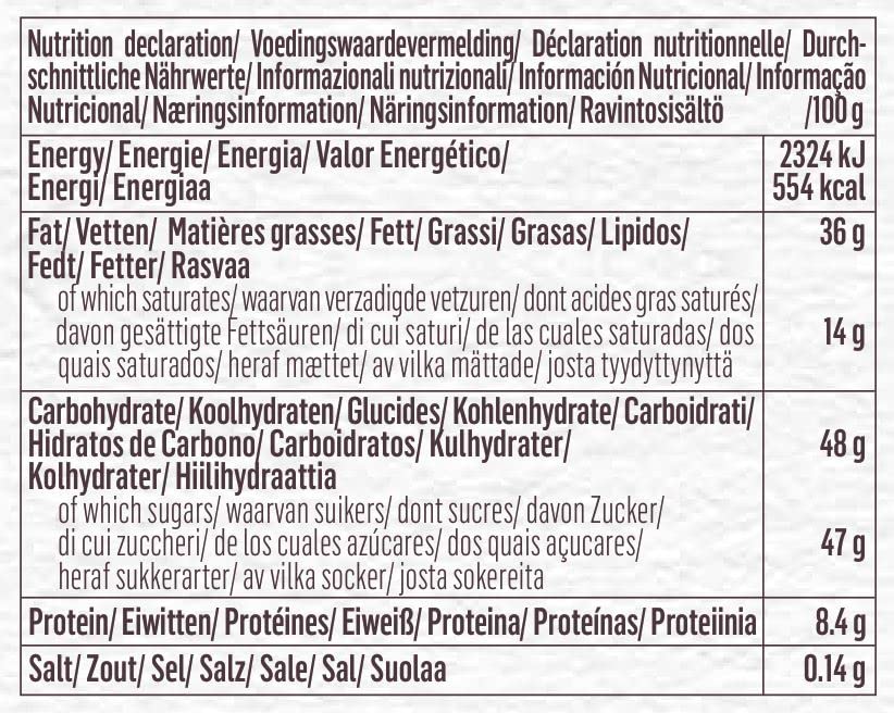 Sugar, hazelnoten (23%), whole milk poeder, cocoa boter, cococoa massa, emulsifier: zonnebloem lecithine, natuurlijke vanille smaak. Cocoa solids: chocolade 48% minimum, melkchocolade 31% minimum, witte chocolade 25% minimum. Milk solids: melkchocolade 23% minimum, witte chocolade 29% minimum. Kan andere boommoeren bevatten, WHEAT en SOYA.