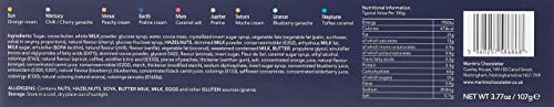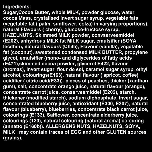 Smaken: Orange Cream, Chilli / Cherry Ganache, Peachy Cream, Praline Cream, Caramel Zout, Praline, Mocha Cream, Blueberry Ganache, Toffee Caramel.