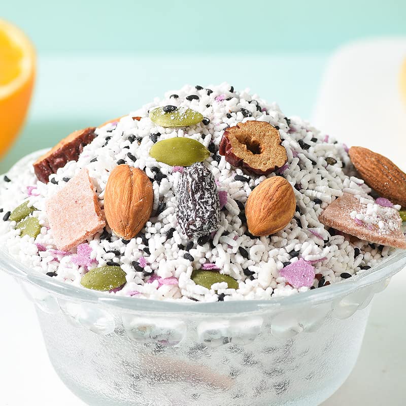 Grondstoffen en ingrediënten: lotuswortelpoeder, rozijnen, gedroogde rode dadels, meidoornplakjes, pompoenpitten, zwarte sesam, osmanthus