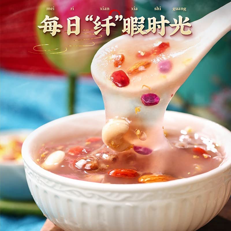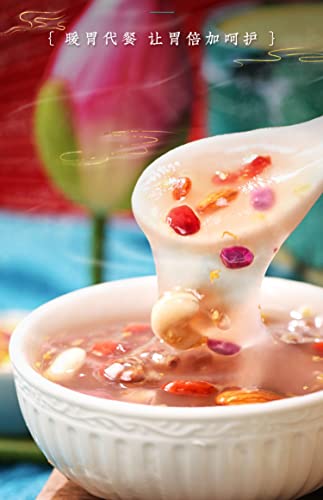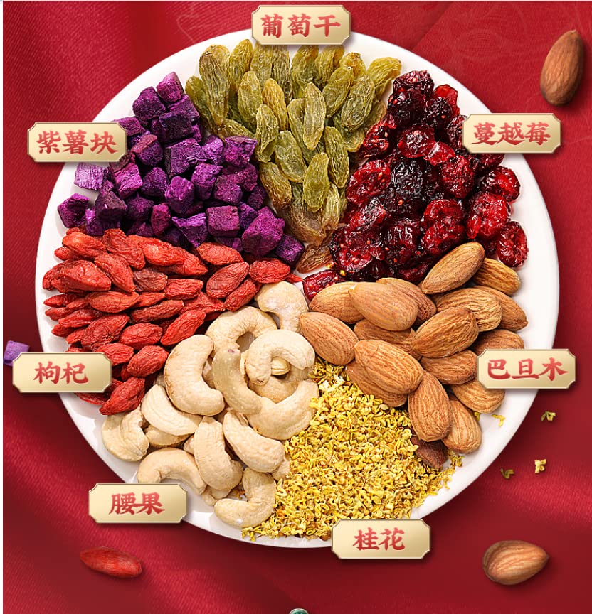 Grondstoffen en ingrediënten: lotuswortelpoeder, rozijnen, gedroogde paarse aardappel, osmanthus, cranberry, amandelen, cashewnoten, enz
