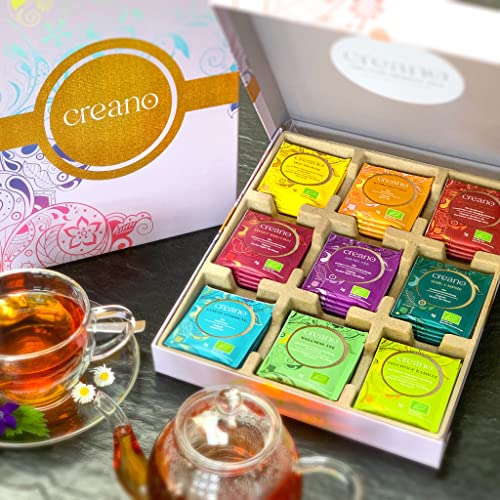 Creano Biologische kruiden-fruit-kruidenthee-mix cadeauset “Organic Herbal Tea” is een unieke mix van de verschillende biologische theesoorten: fruitige kamille, hot gember, kurkuma-chai, rooibos-mango, zoete rood-chai, avondthee, zoete munt, zachte sfeer en wellnessthee; 100% biologisch, 9 x 5 theezakjes